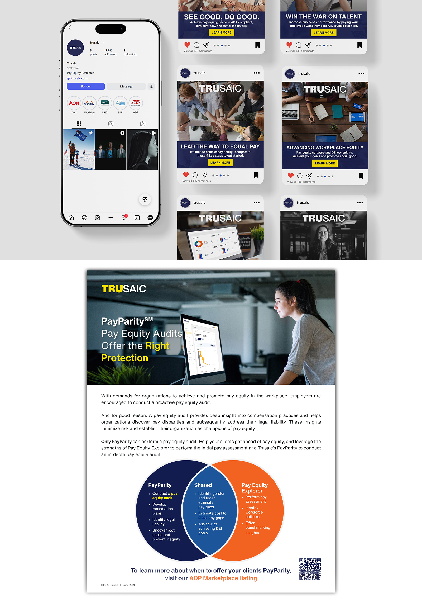 Digital media and print assets for Trusaic's pay equity software.
